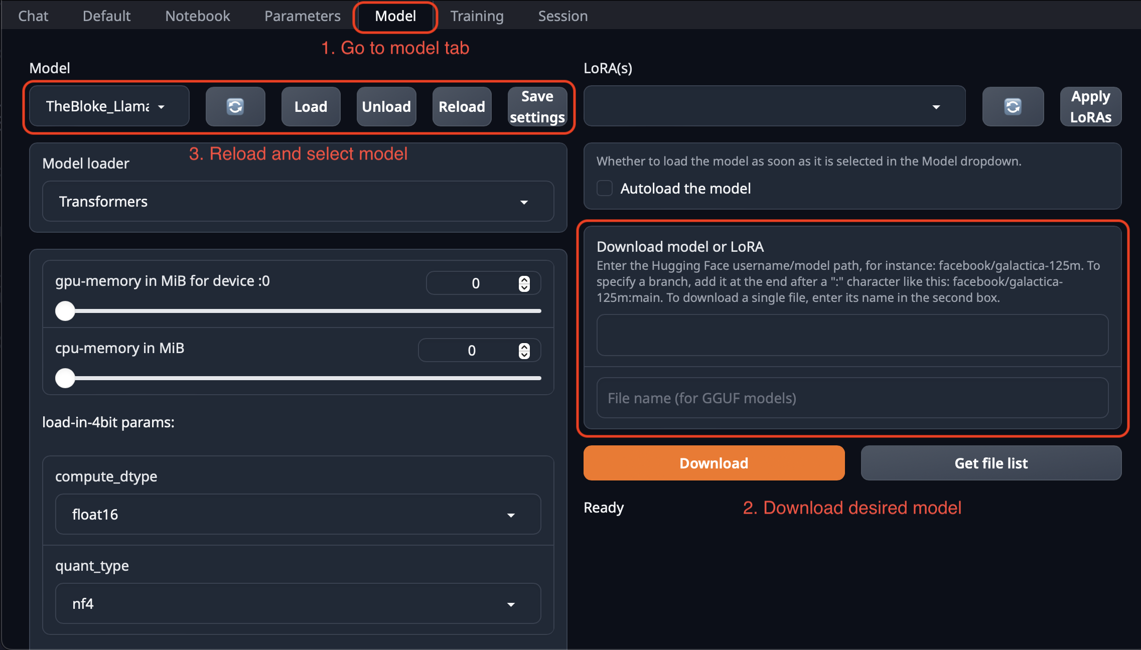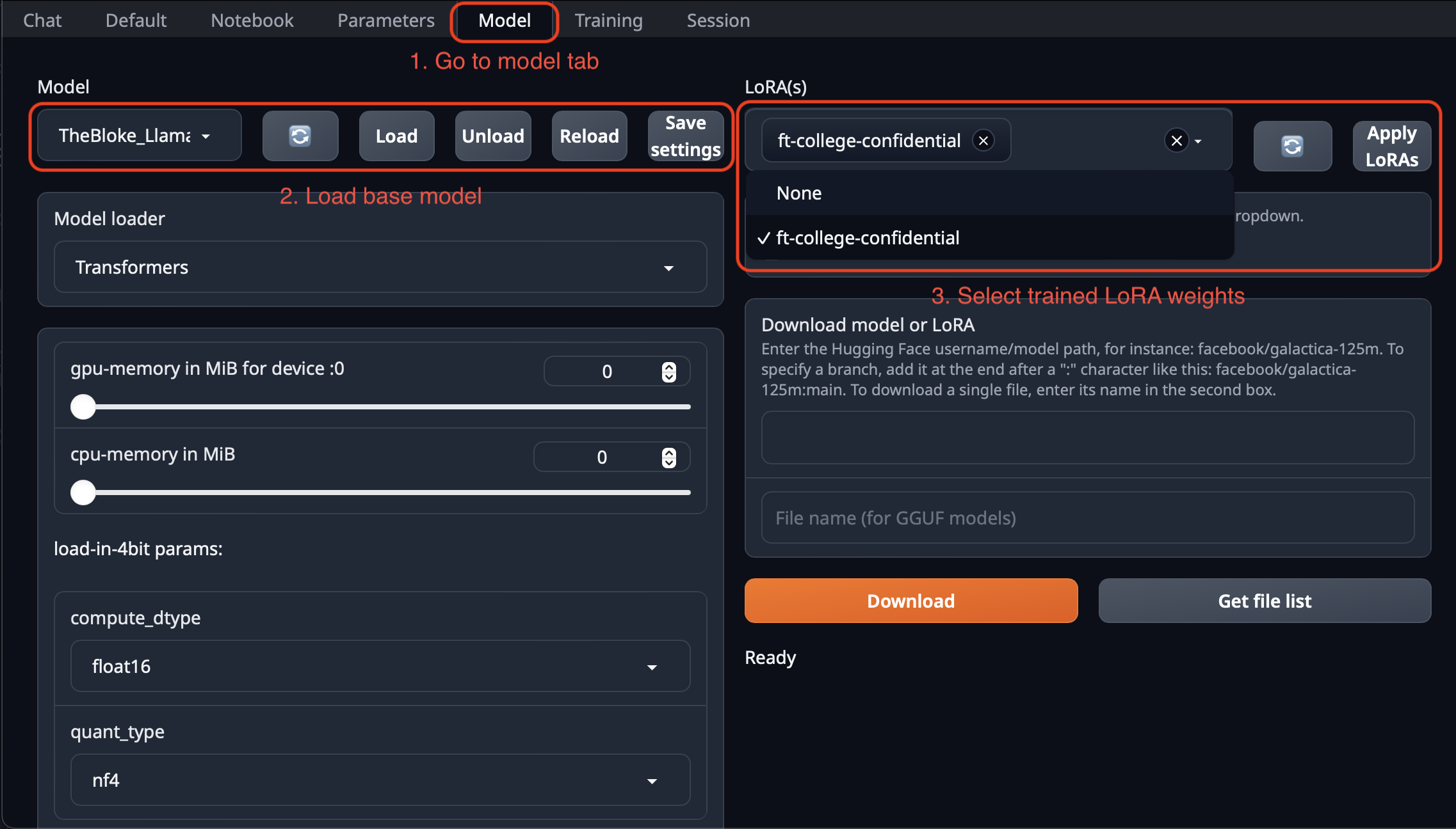 Once your model is trained, you can load the LoRA model on top of your base model by selecting it from the model tab of the WebUI.