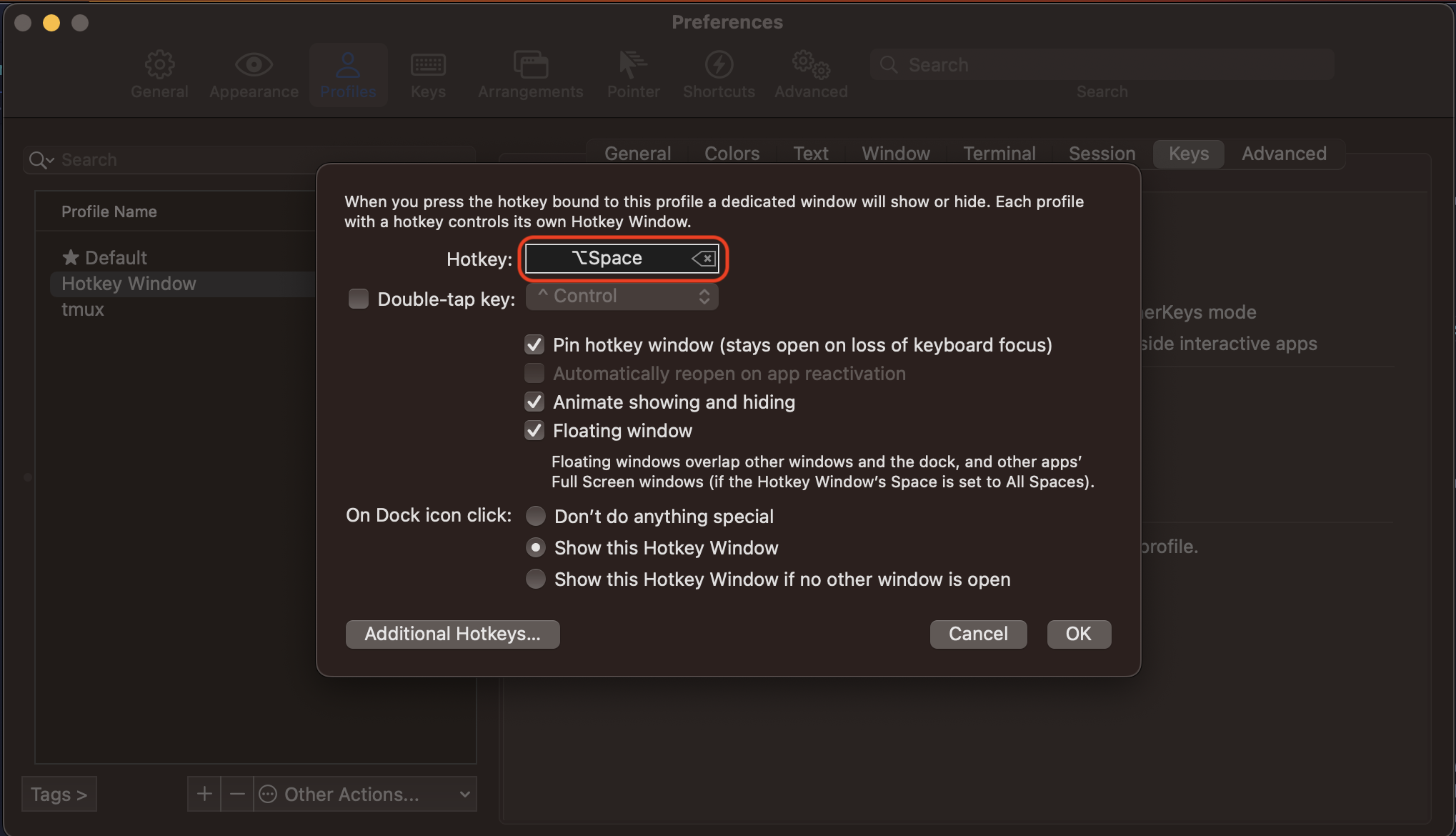 Once you are done, you should be able to bring up the termianl window by pressing the designated hotkey. Be careful not to overwrite existing hotkeys in MacOS or any other software! I use option + space, which does not conflict with any software I use.