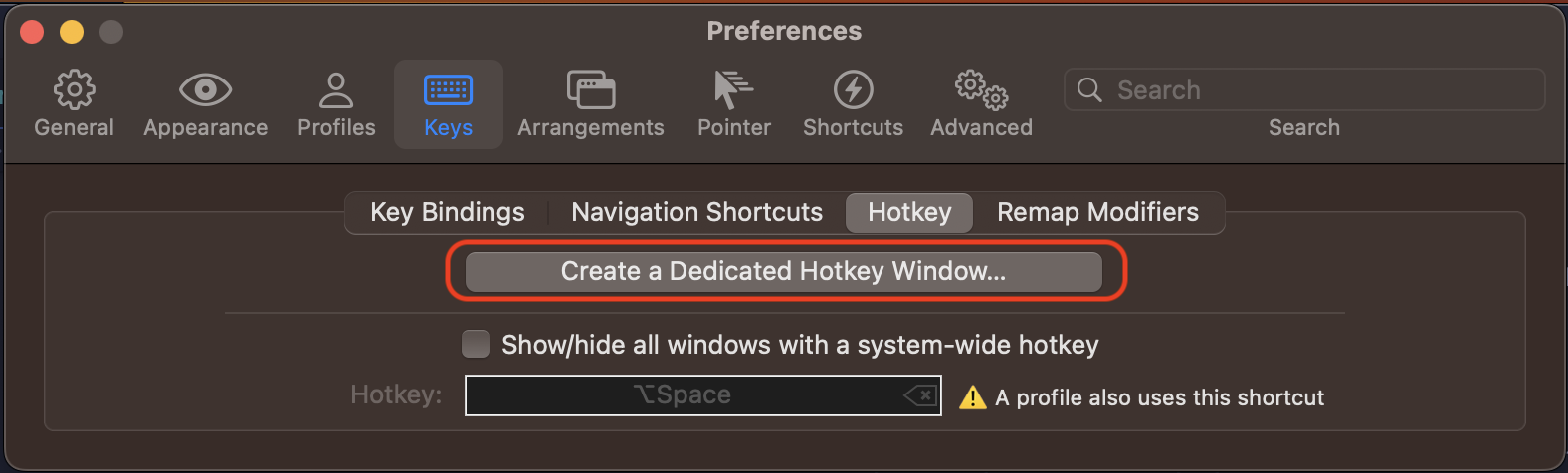 As mentioned before, you can also set a hotkey to show and hide the terminal window. You can do this in setting -> keys -> hotkey. Select Create a Dedicated Hotkey Window option if you want to have a single window bound to the hotkey, or set Show/Hide all windows with a system-wide hotkey option if you want to show all the terminals.