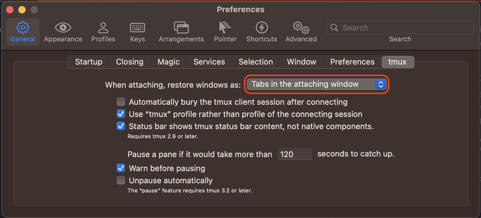Tip: If you don't want the tmux session to create a new terminal window, you can change the behavior in settings -> general -> tmux -> and toggling the When attaching, restore window as: option to Tabs in the attaching window.