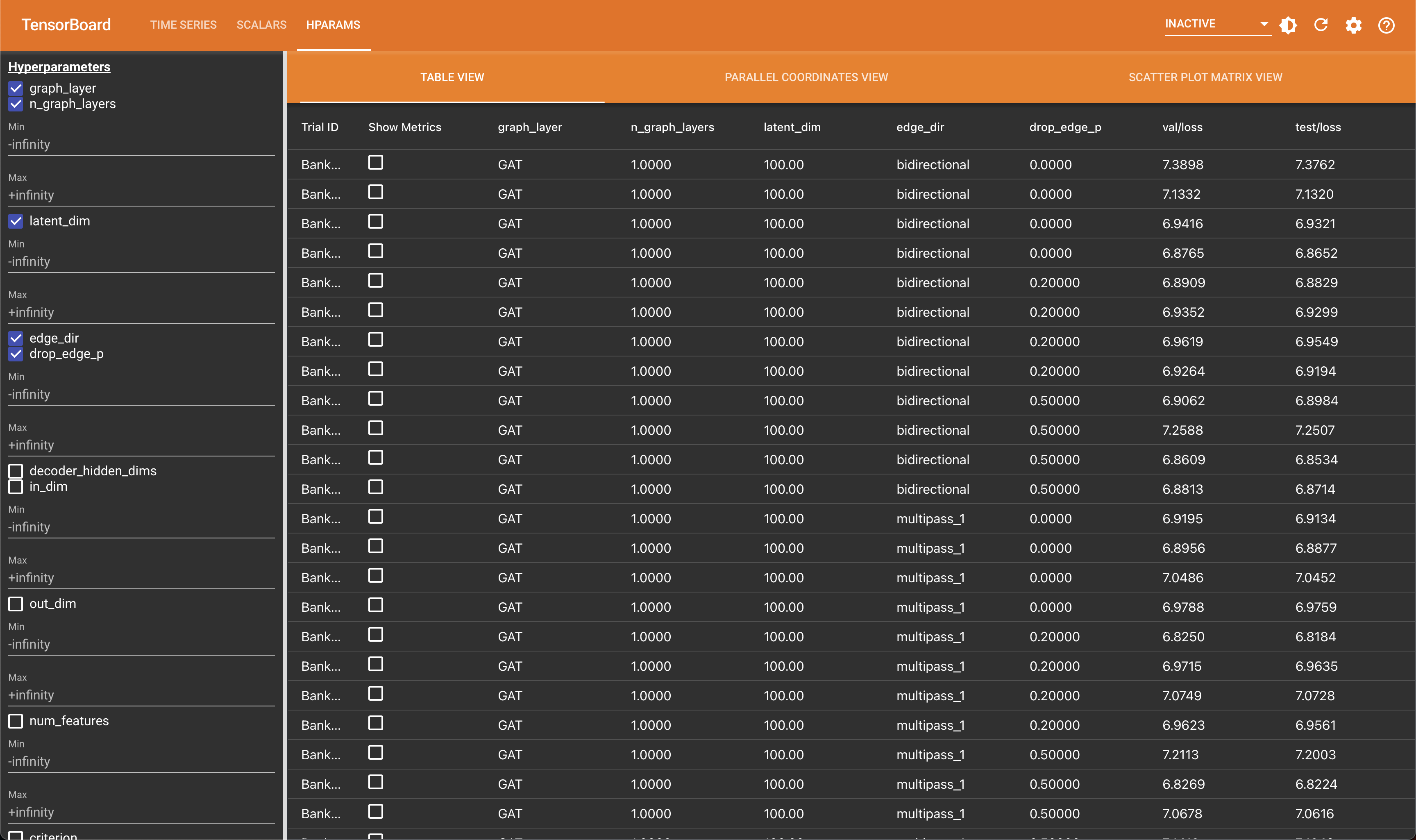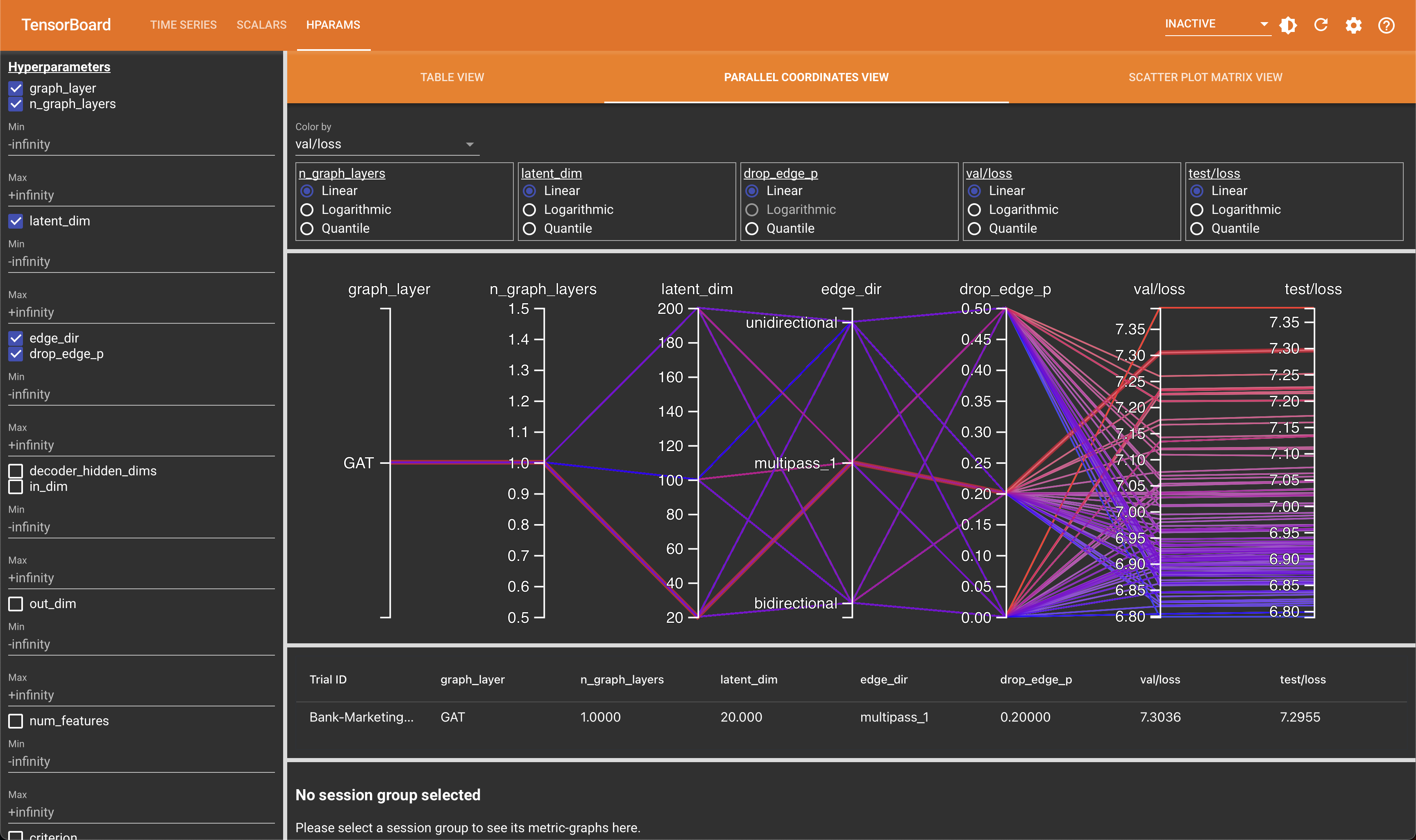 I simplified the code, but this really is most of what you need to do to make Ray Tune work with your pytorch-lightning model. Ray Tune stores its logs under ~/ray_results. You can take a look at the same hyperparameter page we saw earlier if you run tensorboard on this directory (i.e. tensorboard --log_dir ~/ray_results). Unlike before, it is done algorithmically and you do not need to do anything related to hyperparameters on the torch lightining side (i.e. no need for save_hyperparameters anymore).